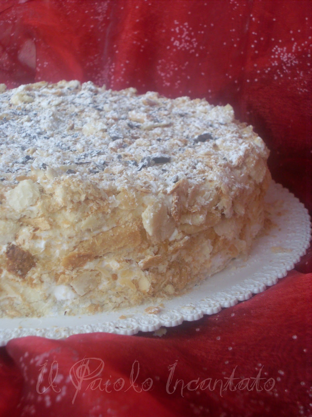 Comporre la millefoglie alternando strati di sfoglia, crema chantilly e gocce di cioccolato. Terminare con la crema, le briciole di sfoglia tenute da parte e spolverare con zucchero a velo.